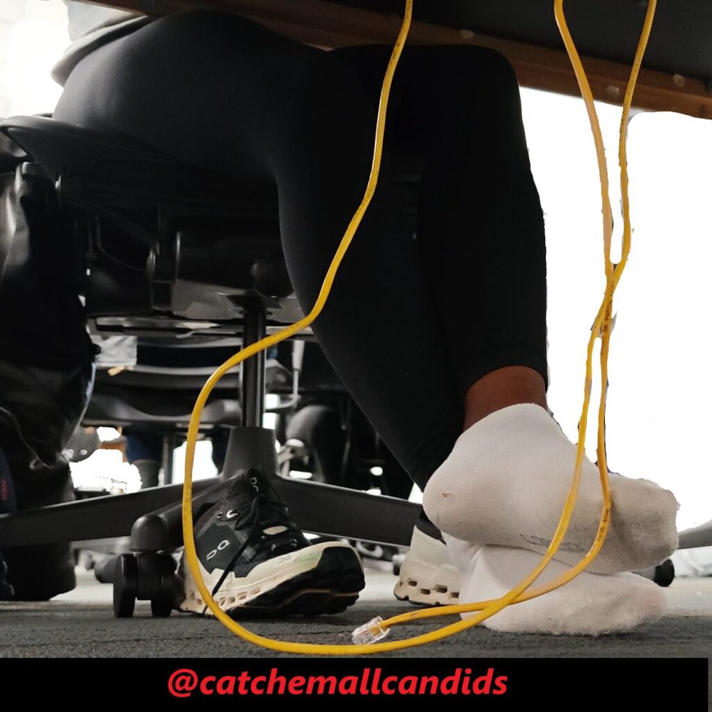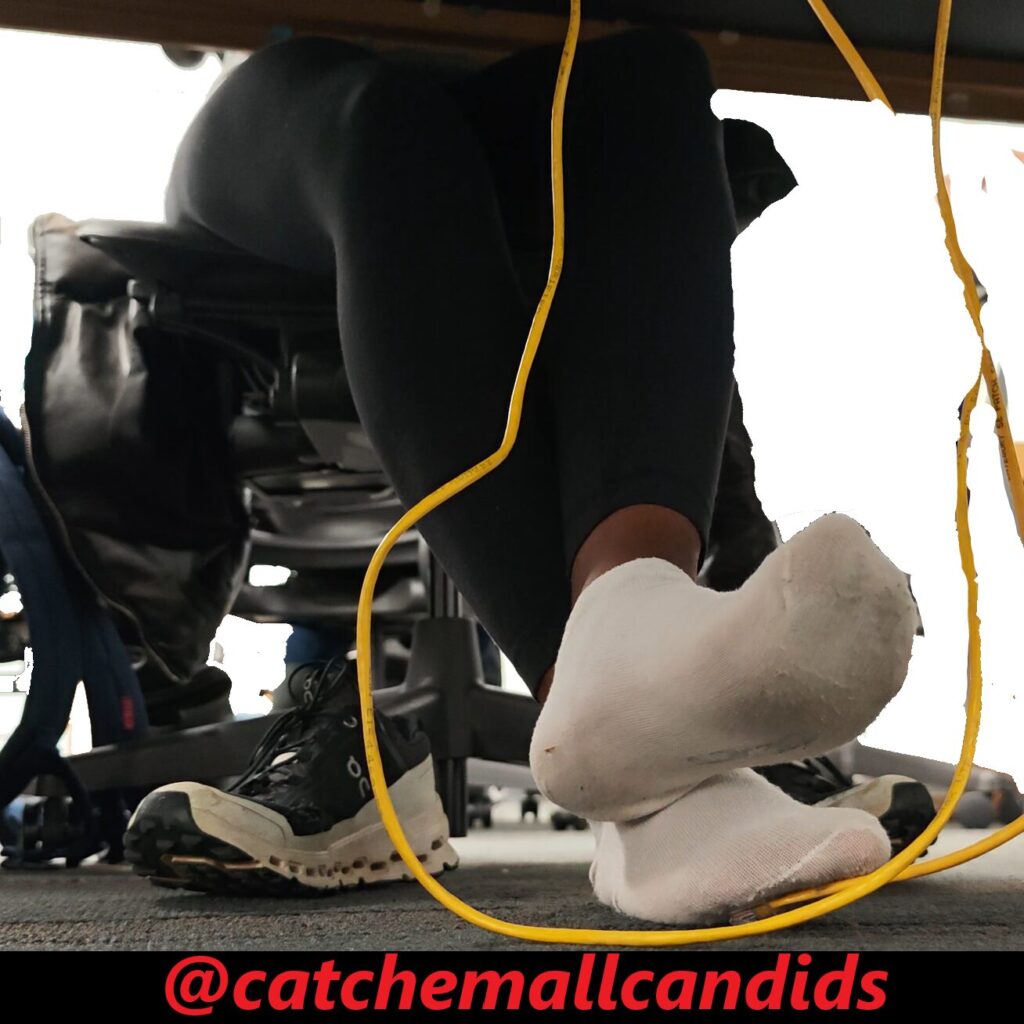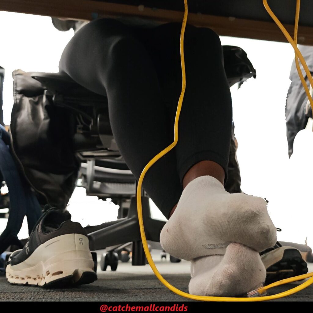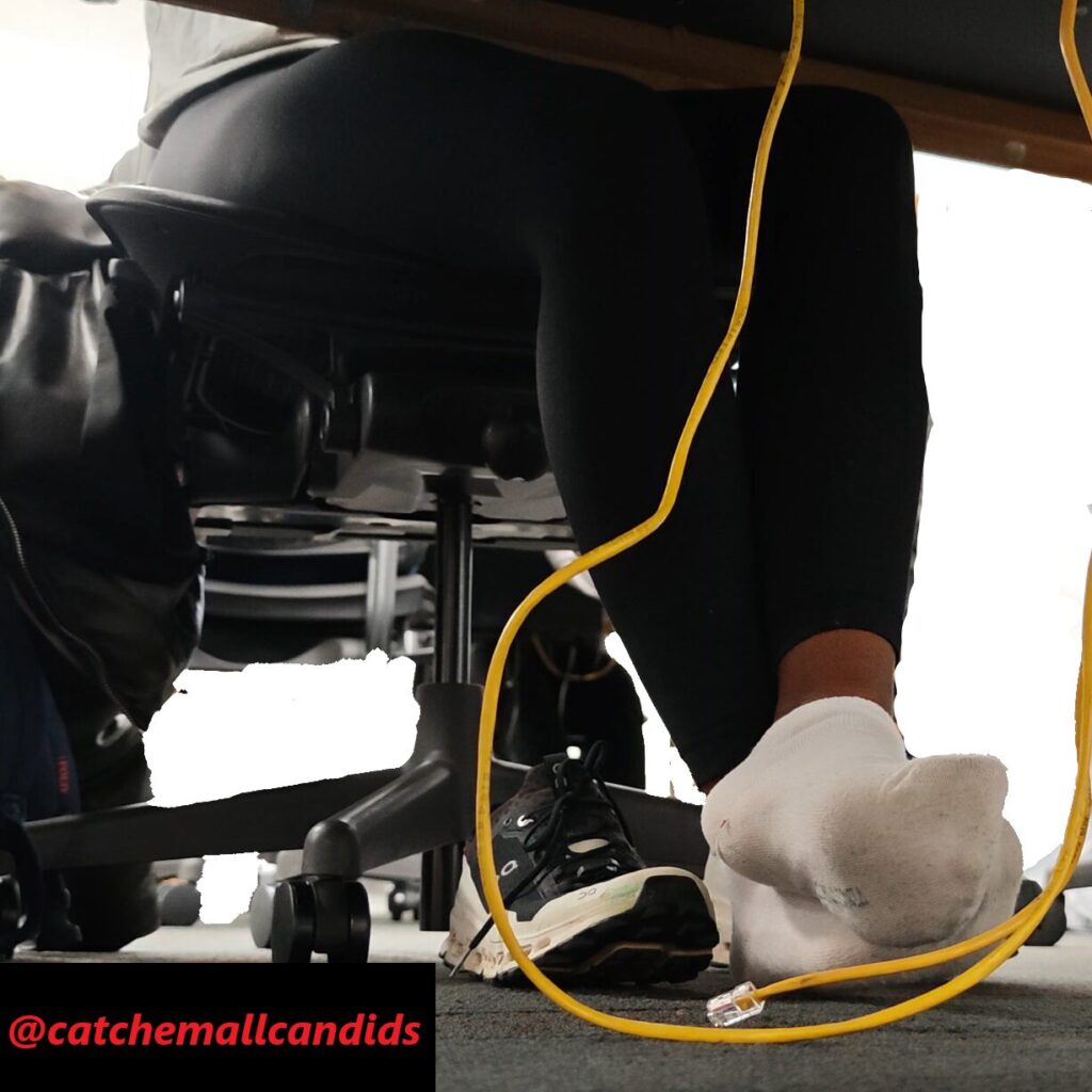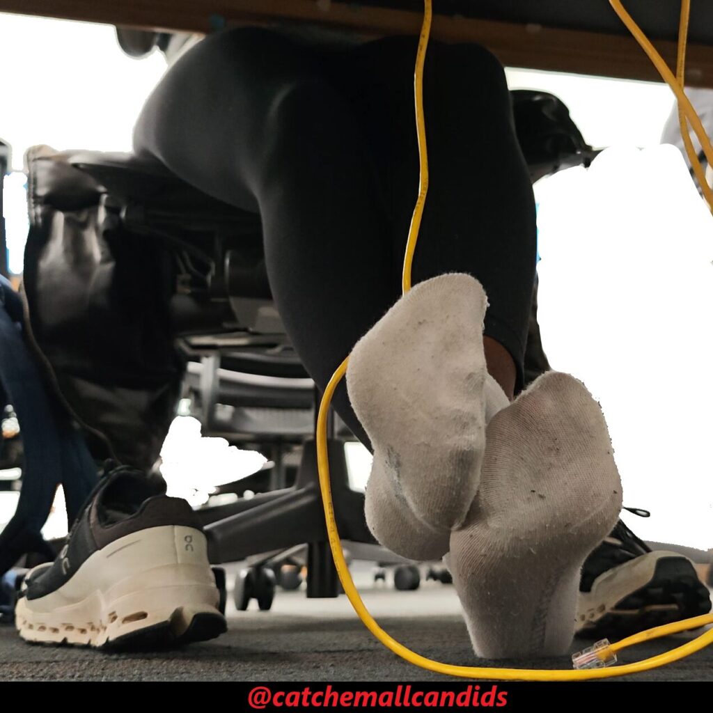Regular that takes her shoes off every chance she gets no matter if she is wearing socks or not. In this video late in the day, she has her cloud ultras off and visibly dirty socks with leggings. In the beginning of the video she almost tugs part of her sock off as it seems she just has the habit of being barefoot. She frequently stretches her feet out and uses the balls of her feet to rub on the Ethernet cable. She also crosses her legs over the other as she uses her feet to play with the wire. This video gets great frequent angles of her dirty socked soles and last for over an hour.