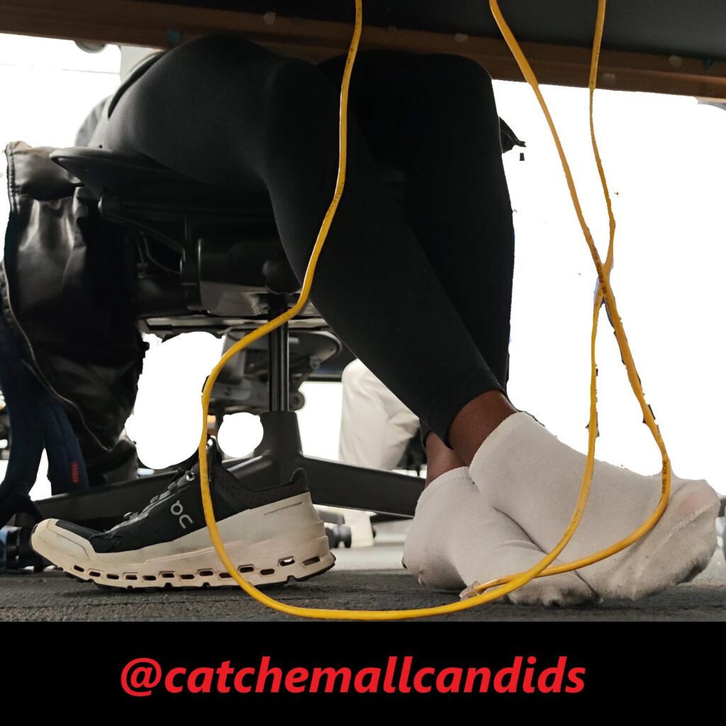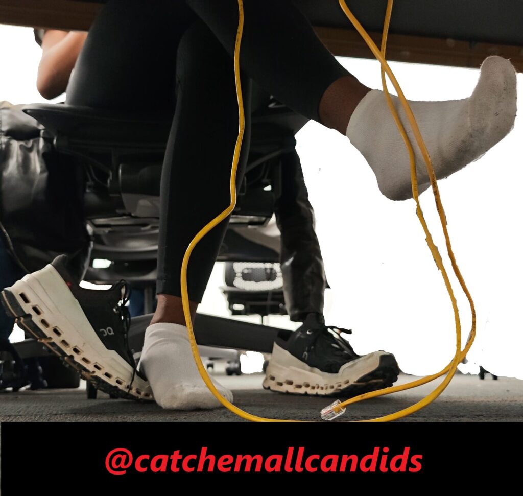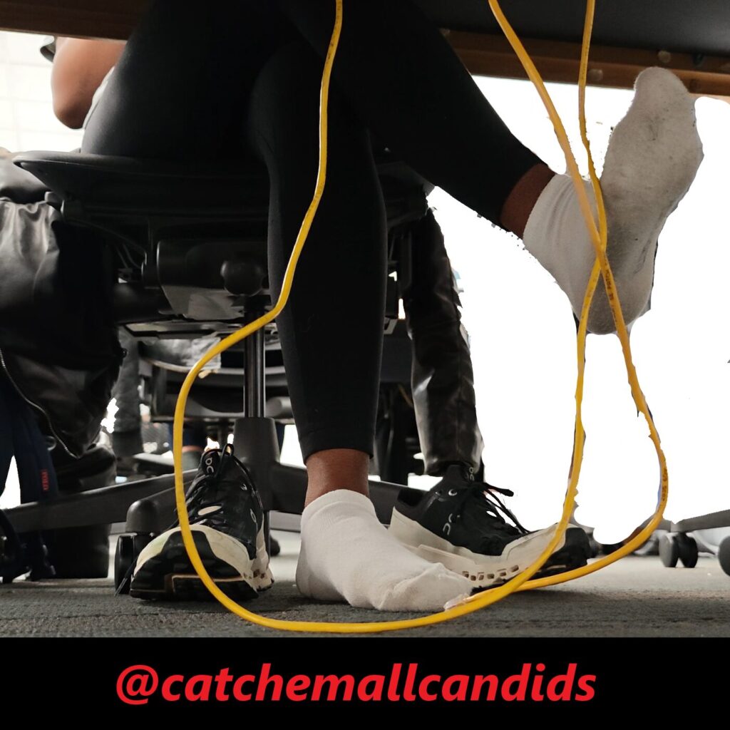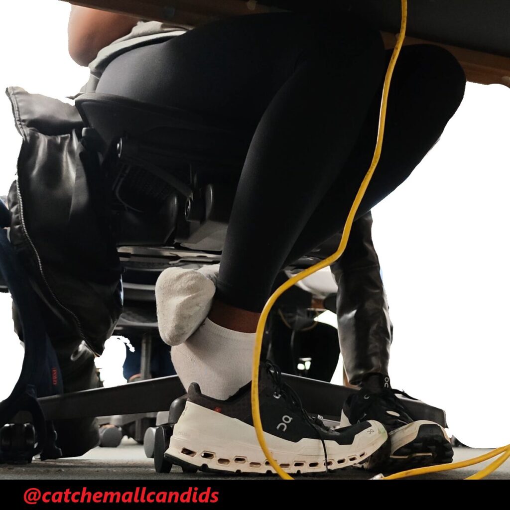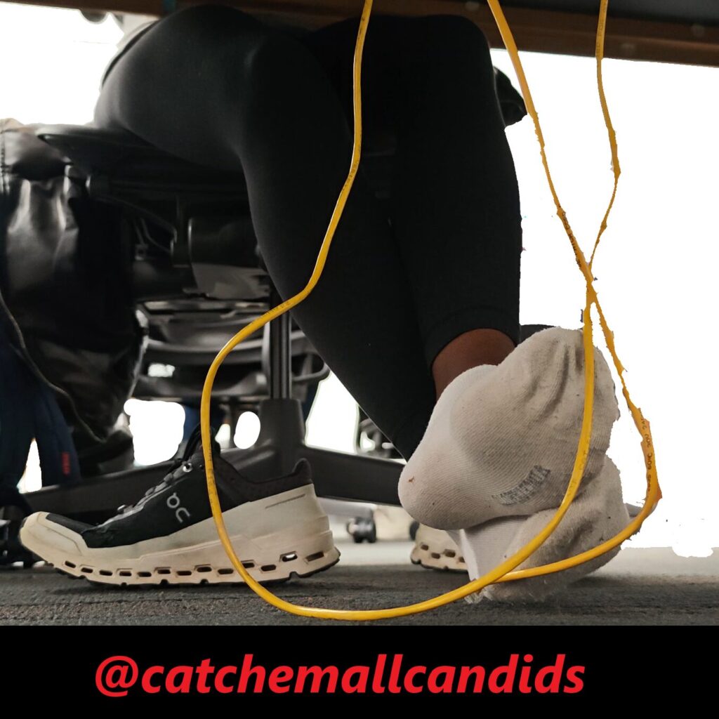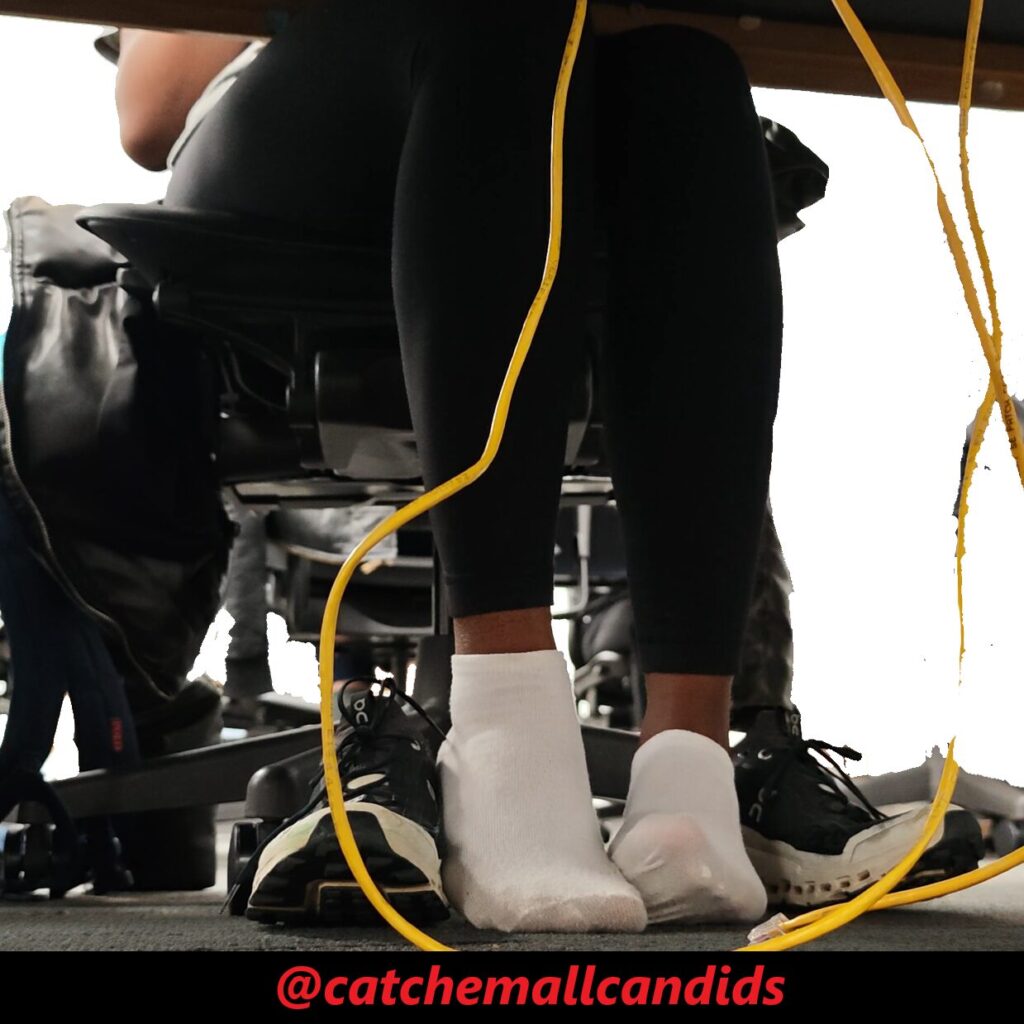 Regular that takes her shoes off every chance she gets no matter if she is wearing socks or not. In this video late in the day, she has her cloud ultras off and visibly dirty socks with leggings. In the beginning of the video she almost tugs part of her sock off as it seems she just has the habit of being barefoot. She frequently stretches her feet out and uses the balls of her feet to rub on the Ethernet cable. She also crosses her legs over the other as she uses her feet to play with the wire. This video gets great frequent angles of her dirty socked soles and last for over an hour.