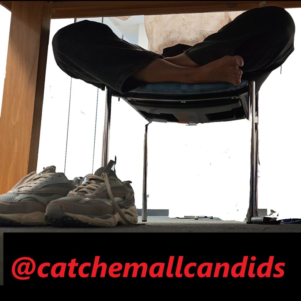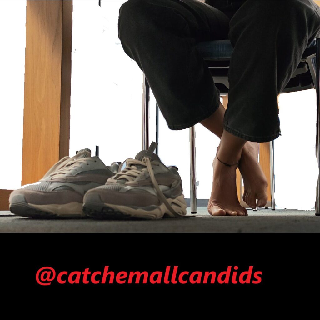 An Indian women barefoot out of sneakers and socks. She starts with her legs crossed in her seat as you see her toes, after a couple of minutes she puts her feet down and eventually stretches them out. She stretches and rubs her feet back and fourth for 4 minutes straight. There was a noticeable corn chip smell coming from her feet. After that she goes back to her feet in her chair before she puts her socks and sneakers back on and leaves.